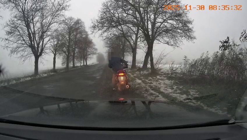 Wyjeżdżając ze stacji paliw w Dolsku policjant zauważył motorowerzystę poruszającego się bardzo powoli i niepewnym torem. Pojechał za nim i obserwował jego zachowanie. Kierujący poruszał się najpierw drogą wojewódzką nr 434 w stronę Śremu a następnie skręcił w kierunku Kotowa i zatrzymał się na poboczu, przekonany, że za nim jedzie nieoznakowany radiowóz. W rzeczywistości jechał za nim policjant w prywatnym aucie.