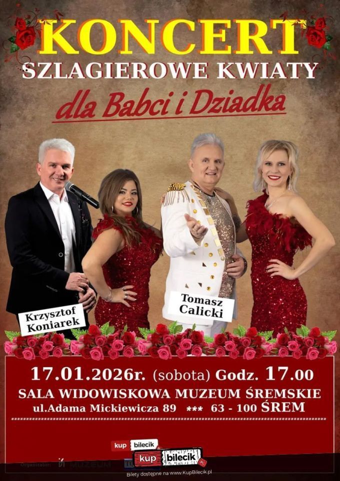 Któż z nas nie kocha swojej Babci i swojego Dziadka? Z okazji ich święta serdecznie zapraszamy na koncert "Szlagierowe Kwiaty dla Babci i Dziadka". Czeka nas wieczór pełen emocji, wspaniałej, melodyjnej muzyki, pozytywnej energii i wzruszeń. Nie zabraknie także dobrego humoru - o wszystko zadbają Krzysztof Koniarek z zespołem oraz Tomasz Calicki z zespołem, artyści znani m.in. z anteny telewizji TVS oraz wielu rozgłośni radiowych. Spotkajmy się na koncercie i wspólnie świętujmy ten szczególny dzień!